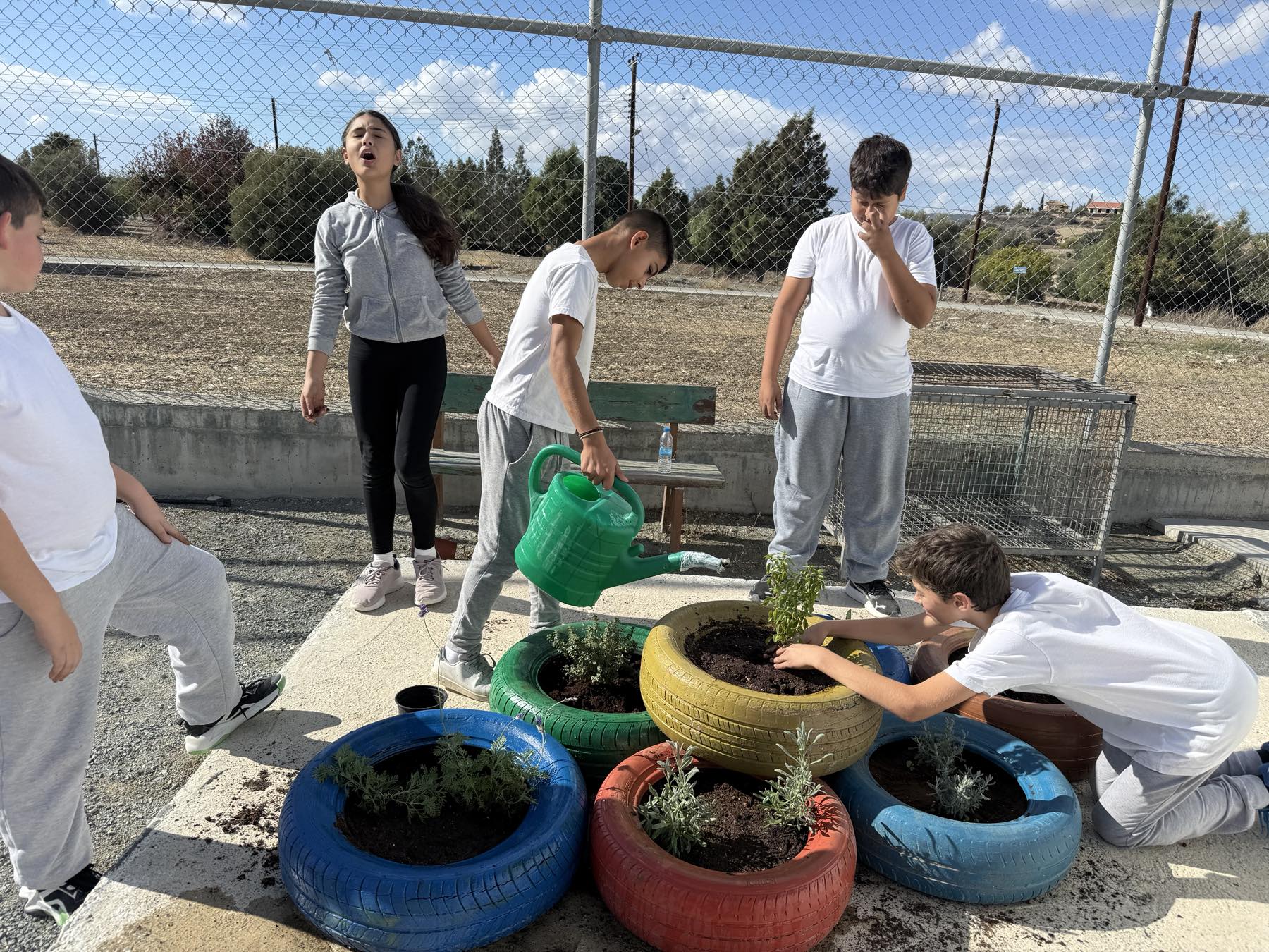 Τα παιδιά της Στ΄ τάξης είχαν την ευκαρία να δημιουργήσουν ένα μικρό, διαφορετικό βοτανόκηπο, αξιοποιώντας ελαστικά αυτοκινήτων που βρίσκονταν στην αυλή του σχολείου. Με την καθοδήγηση των δασκάλων τους, Ηρόδοτο Ηροδότου και Άντρο Φουρλά, φύτεψαν αρωματικά φυτά σε κάθε ελαστικό, μετατρέποντάς τα έτσι, σε παρτέρια.